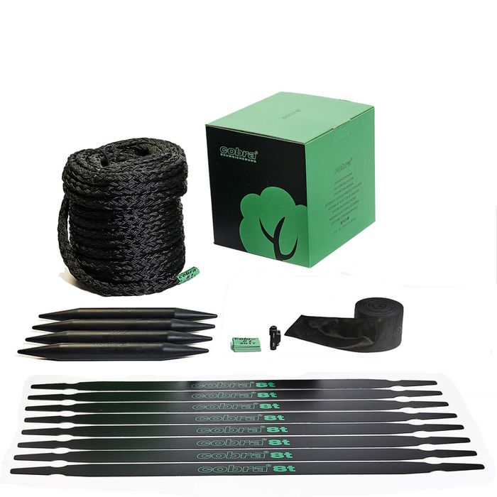 The 4 system-package cobra 8t contains sufficient material for 4 dynamic tree cabling. For the installation, only scissors are required (separately available). According to 'ZTV Baumpflege'*, cobra 8t is suitable as dynamic tree cabling for branches/stems having a diameter of 60 - 80 cm. The required minimum system tensile strength of 8t is guaranteed for a full period of 8 years.