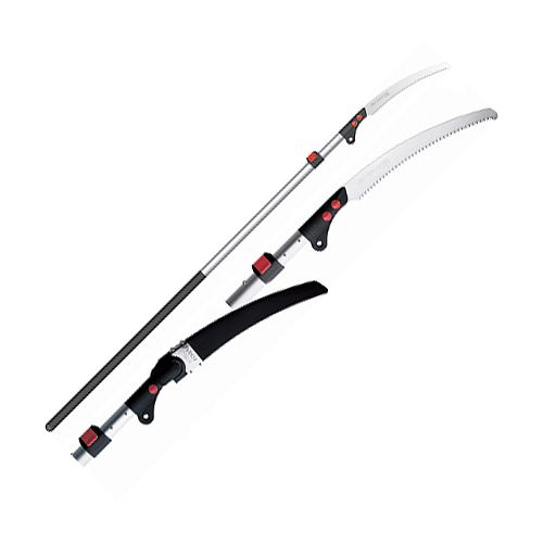 A lightweight professional grade aluminum pole saw. A pole saw with an oval shaped cross-section. Aluminum in construction, this saw can perform the heaviest of work. The ZUBAT pole saw has the same curved blade as ZUBAT hand saw. The base pole has a comfortable sponge rubber grip. The pole has a lever lock with spring loaded buttons at the end of each length. The oval aluminum alloy extension pole gives precise control to the direction of the saw blade (especially important for high cutting) and strength and rigidity to the pole, reducing bending to the minimum. Push buttons allow multiple length adjustments and safety clamps hold the extensions firmly in place. Very lightweight and easy to maneuver.
