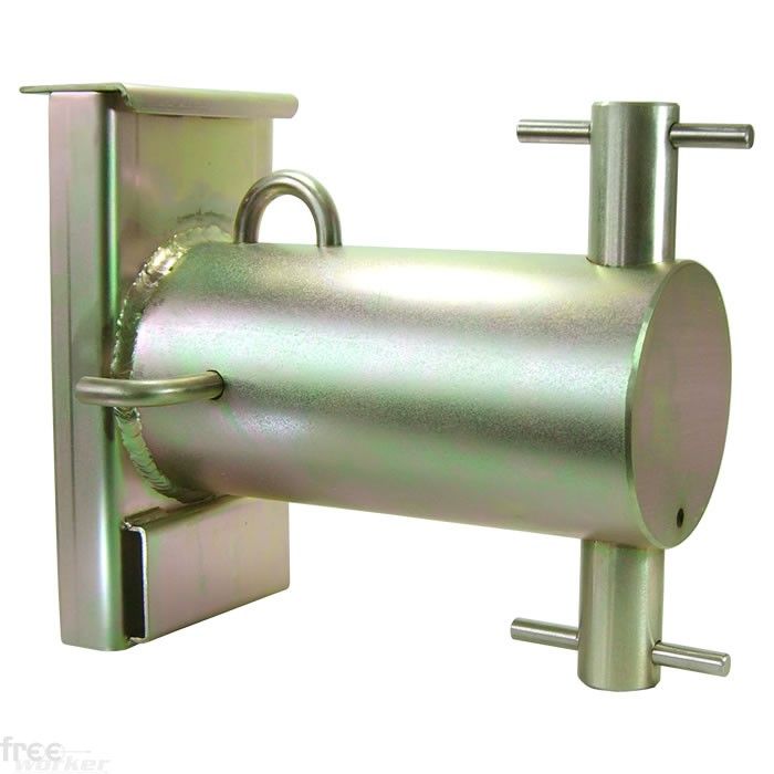 This rigging bollard is the pro on the scene, featuring the experience of many rigging years. The diameter of the break-pipe has been enlarged which allows the rope to run smoother and to kink less, its length shortened resulting in reduced leverage. The two "noses" at the end of the break tube have been reoriented and offer removable pins allowing the groundsman to flick off the rope to reduce the number of wraps. A better duct for the lashing straps prevents slippage and a longer bridge for deeper fitting into the wood results in a better hold with the tree trunk. The device body is gold zinc, the pins are made from steel.