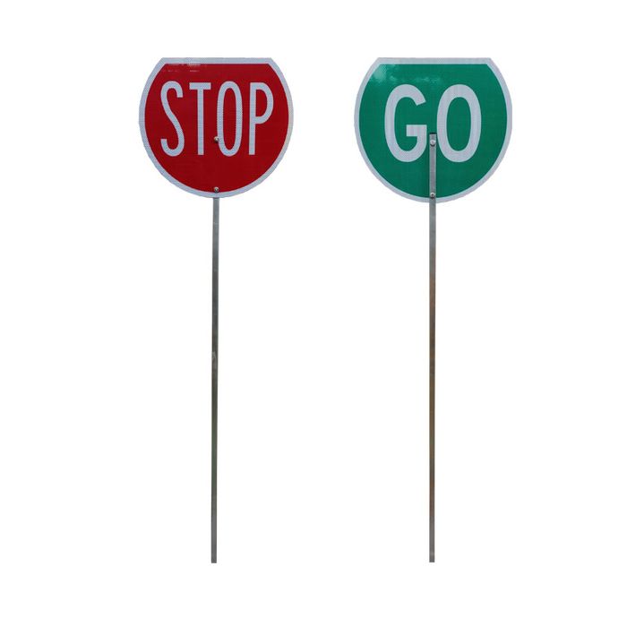 | Stop/Go - This sign can only be used by properly trained individuals to control traffic at the work site on two land roads where only one traffic lane is available and where the use of a temporary traffic signal is unnecessary |