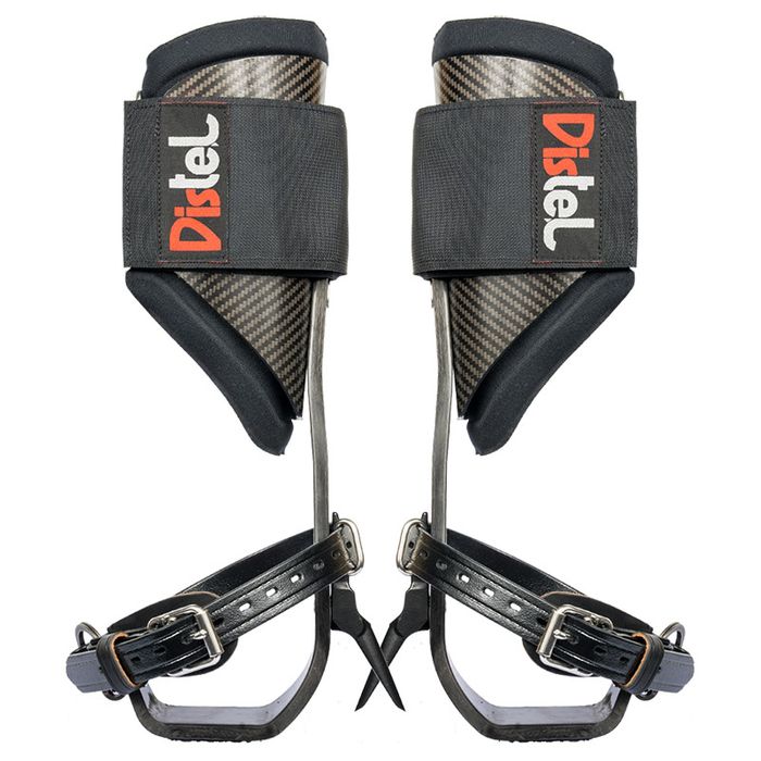 Distel Carbon 3 climbers with wide, comfortable velcro leg straps, 2020 pads which are removable, washable and adjustable, Weaver foot straps and a choice of American style tree or pole gaffs. Adjustable from 34.3 to 47.8cm in steps of 0.6 cm.