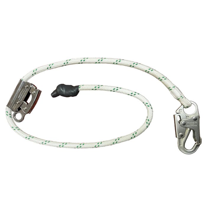 The 1.5m polydyne rope (body belt not included) has a quick mechanical rope adjuster, permanent stopper knot at one end and quick release double locking hook at the other end.