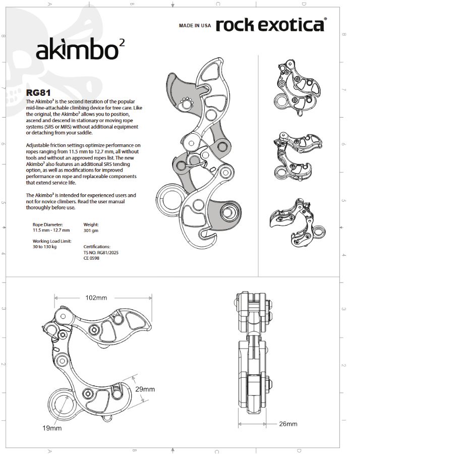 The Akimbo² is a unique arborist climbing tool that enables the climber to ascend, descend and position on both stationary and moving rope systems. The Akimbo² features rope contact surfaces (Upper and Lower Bollards) that adjust to accommodate a wide range of rope sizes to suit the climber's needs or preferences—all without tools or disassembling components. The Bollards can also be adjusted to increase or decrease friction to accommodate changes in climber weight, changes in environment, or adjust for natural wear of the Akimbo's contact surfaces.