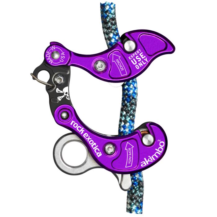 The Akimbo² opens easily to remove or install a rope mid-line in seconds, and compresses back down into a compact form factor both on and off the rope. When climbing on stationary rope with a chest harness (SRS mode), Akimbo² offers two auxiliary connection points. The upper connection utilizes a wire gate that allows for the quick connect or disconnect of a non-PPE carabiner or loop of cord, while the main life-support connection point can also be used for attachment of a chest harness with a non-PPE carabiner.
